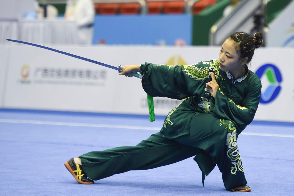 11月7日,天津选手王梦甜在第一届全国学生(青年)运动会中学组女子自选太极剑决赛中获得冠军。新华社记者 侯昭康 摄