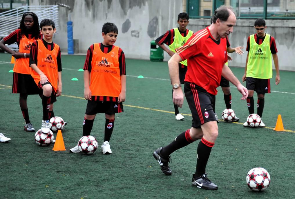 资料图:巴雷西(前右)在向小学员示范盘球。新华社记者 卢炳辉 摄