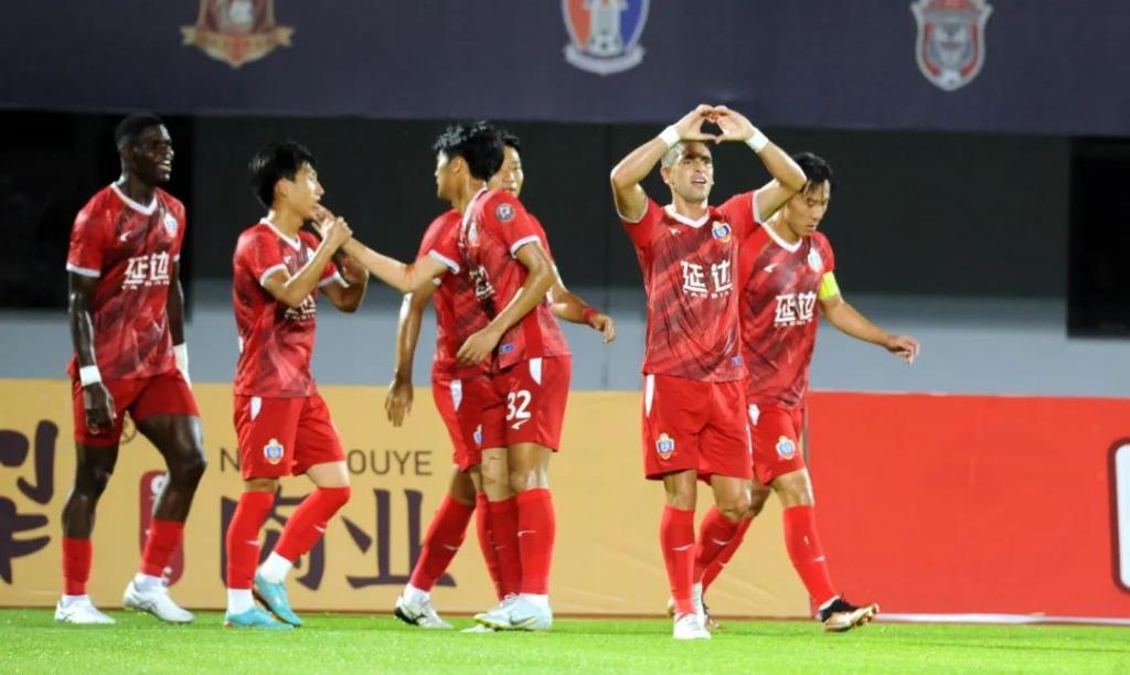 延边龙鼎队球员庆祝进球。(图片来自中甲联赛官方微博)