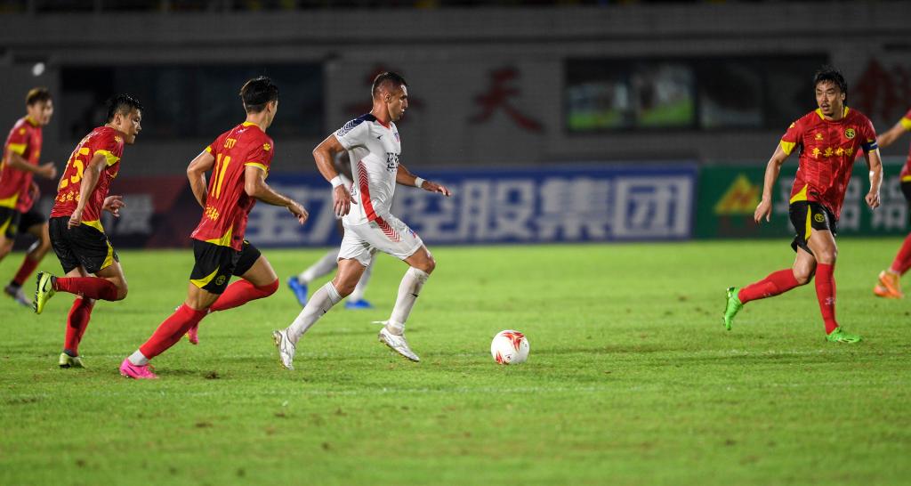 延边龙鼎队球员伊沃(左四)带球突破。新华社记者 曹祎铭 摄