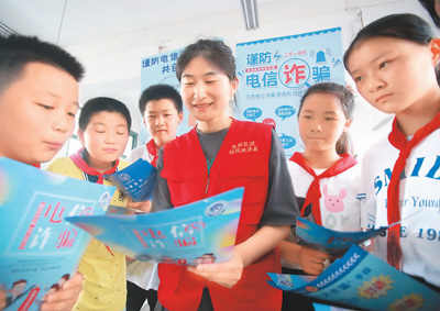 5月31日,在江苏省扬州市汤汪中心小学,社区志愿者给学生们介绍防范电信诈骗、保护个人信息的知识。孟德龙摄(人民视觉)