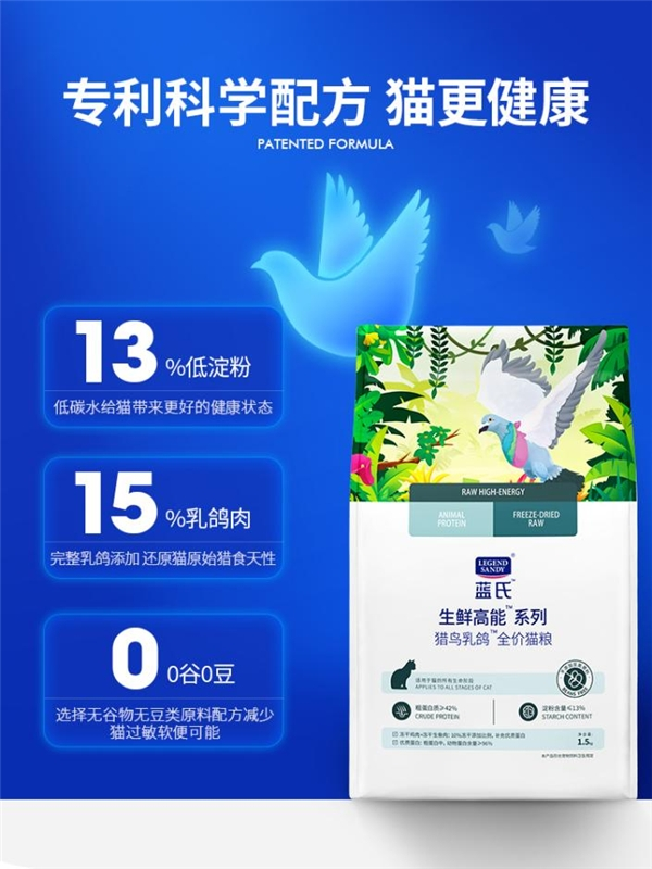 此次,由中国农业大学提供技术指导支持,蓝氏研发中心制作推出的重磅产品——蓝氏生鲜高能 系列猎鸟乳鸽 全价猫粮,是蓝氏基于过往十余年在宠物食品方面积累的宝贵经验历时18个月研发推出的战略产品。该产品一经面世就凭借品牌独家技术专利、原创生产工艺和独特的乳鸽配方迅速在“内卷”的国产猫粮市场中脱颖而出,成为业内许多品牌争相模仿的对象。自2021年4月上市后,仅三个月便登上电商平台“口碑猫粮排行榜”前五名,冲入“万包俱乐部”。目前,生鲜高能 系列猎鸟乳鸽猫粮已经累积销售超过5w包,在销量激增的同时,还常年保持在天猫好评口碑猫粮排行榜前几名的位置,得到了市场和口碑双重认可。