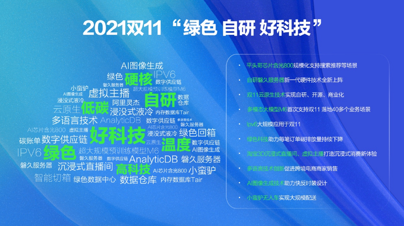 “双11是一个重要的技术练兵场,不仅淬炼出云计算、人工智能等高科技,也驱动我们不断创造好科技。无论是通过绿色科技创新参与到社会减碳行动,还是通过人机交互技术和自动驾驶技术提升用户体验,我们都在朝好科技的方向不断前进。今年双11将成为阿里好科技的新起点。”程立表示。