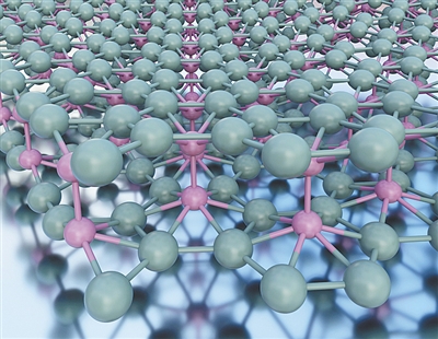 图为双层硼烯的原子结构。图中所有原子都是硼,粉红色的硼原子参与了层与层之间的键合。图片来源:美国西北大学