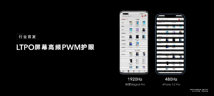 屏幕是影响手机体验的核心原件,用户与手机的交互体验都直接作用于屏幕上。在行业LTPO屏幕调光频率只有480Hz的情况下,荣耀的算法团队与京东方硬件供应商联合开发,让荣耀Magic4系列的LTPO屏幕率先实现了1920Hz的PWM高频调光技术,带来更护眼更流畅的视觉体验。