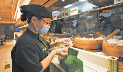 4月1日起,北京市正式实施《网络餐饮服务餐饮安全管理规范》,明确入网商户打包时“应使用外卖包装封签或者一次性封口的外包装袋等密封方式”。图为海淀区一家餐饮企业店员粘贴外卖包装封签。