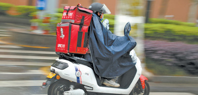 在江苏苏州市街头,一名外卖配送员冒雨骑行,为消费者提供便利。