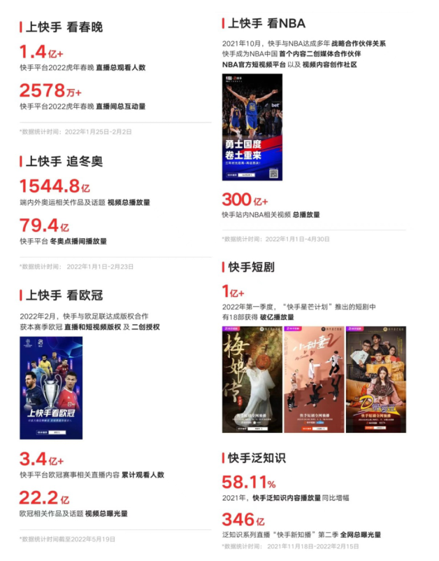 今年一季度,短剧领域,快手星芒短剧孵化出18部播放过亿的短剧。体育领域,快手作为北京2022年冬奥会官方转播商,成为“三亿人参加冰雪运动”的“云上主场”。泛知识领域,快手平台泛知识类内容快速崛起,极大满足了用户对于财经、法律、科技等领域的知识诉求,快手泛知识内容播放量同比增幅58.11%。
