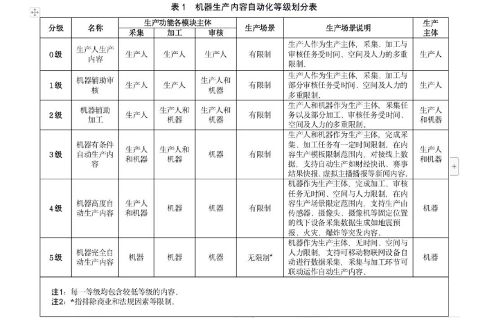 标准基于机器能够自动执行并完成内容生产任务的程度,根据在执行内容生产任务中的角色分配以及有无生产场景限制,将机器生产内容自动化分成0级至5级。