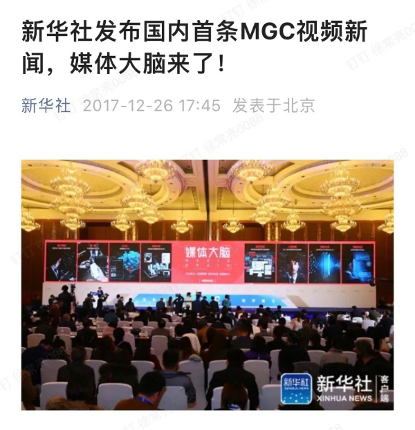2017年,为应对社会传播内容中占比日益减少的PGC(机构生产内容),和占比日益增加的UGC(用户生产内容)的媒体现状,新华社和新华智云立足新闻内容生产自动化场景,联合推出全国首个媒体人工智能平台——媒体大脑,并发布了国内首条由机器生产的MGC视频新闻。