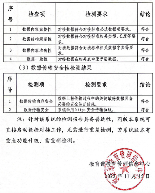 教育部教育管理信息中心近日对吉林省珲春市采用的云思智学课后服务平台系统“云思课后服务平台V2.2.0”开展检测,内容包括资料审核、功能符合性、数据规范及完整性、数据传输安全性等。检测结果显示,云思课后服务平台符合对接标准要求,具备与国家统一平台实现数据对接的能力,能够有效支撑学校开展课后服务工作。且针对该系统的检测报告具备普适性,同版本系统可直接启动数据对接工作,无需进行重复检测。