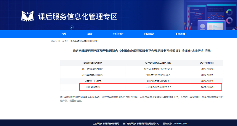 本次教育部教育管理信息中心公布首批地方自建课后服务平台系统通过检测名单,是加快推进义务教育学校课后服务信息化管理工作的重要成果,将进一步促进信息化赋能课后服务质量提升,进一步优化课后服务全流程管理,推动课后服务工作提档升级。
