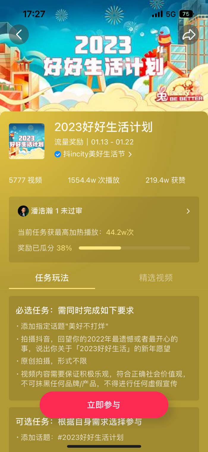 值得一提的是,除了联合艺人和达人打造相关娱乐话题,撬动粉丝关注和参与的“基本操作”之外,抖incity在线上聚力推出“#2023好好生活计划”全民任务,撬动艺人和达人参与,吸引城市青年参与带动发酵UGC内容,表达自己新年伊始的心愿。同时邀请品牌商家参与,从而实现助力区域商家的品牌声量增长。在该全民任务开启第3天,已经获得超过5600条视频投稿。