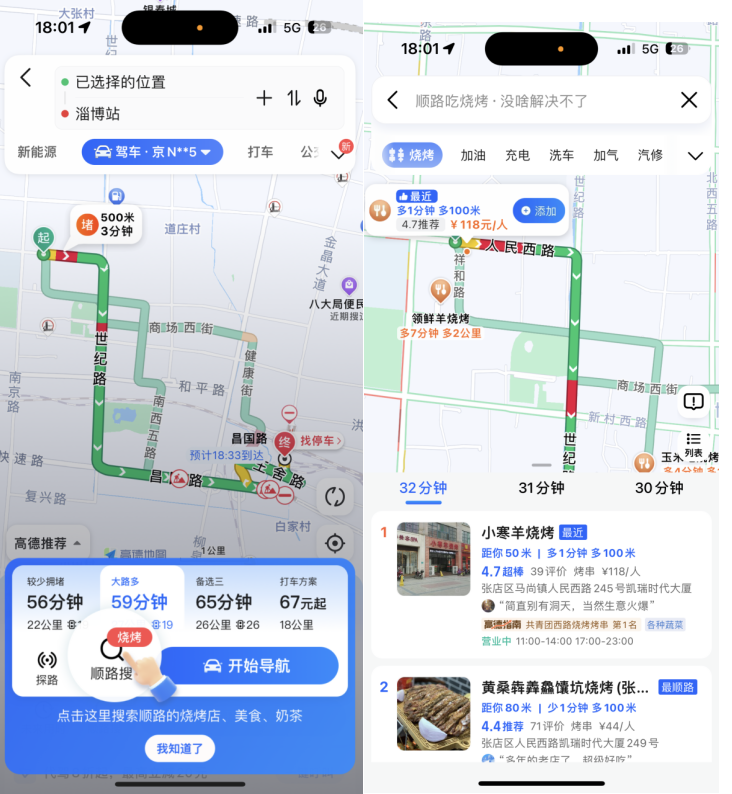 例如针对自主驾车出行的用户,在高德地图中设置好起点和终点之后,点击“顺路搜”中的“烧烤”,即可查看沿途路线的烧烤店铺基本情况,包括用户评分、人均价格、具体地址、营业时间及优惠信息等;而结合高德实时交通算法,更可以根据交通路况,动态计算各个店铺的驾车时长,以便用户更好地综合决策,一键添加心仪店铺作为途径目的地,导航前往。