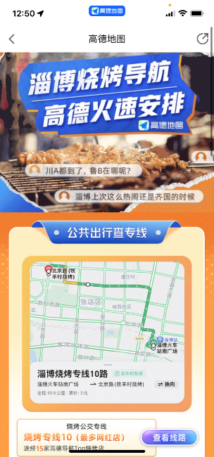淄博市公共交通有限公司特意新增了21条“淄博烧烤”定制专线,从火车站出来,直接坐公交就能去烧烤店。而高德“淄博烧烤导航”也已全盘收录这21条烧烤公交专线,用户可一键点击查看具体路线和相应途径的烧烤店铺,并可在地图上选择心仪站点,导航前往。