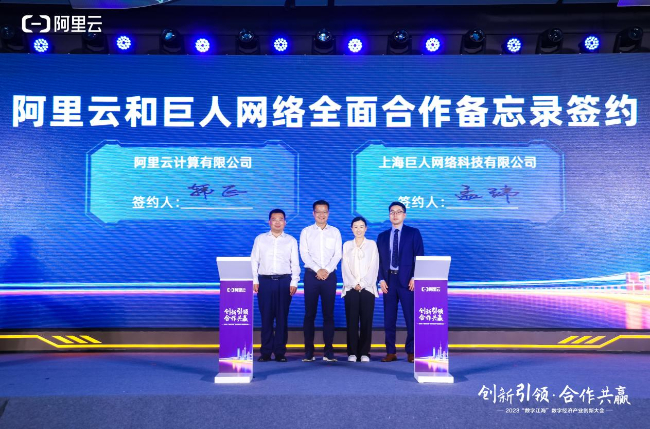 在同日举办的2023“数字江海”数字经济产业创新大会上,双方签署了《巨人网络与阿里云关于“游戏+AI”全面合作备忘录》。阿里云智能首席商业官蔡英华、阿里云中国区副总裁韩飞、巨人网络首席执行官刘伟、巨人网络首席财务官兼董秘孟玮等出席签约仪式。