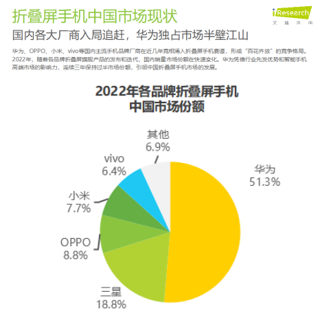 日前,艾瑞咨询研究院发布的《2023年中国折叠屏手机市场洞察报告》中提到,折叠屏手机在2022年逆势上涨154%,同时回顾去年国内市场,以2022年为例,华为折叠屏手机的市场份额达到了51.3%。而另一个数据调研机构Counterpoint数据也显示,2023年第一季度,华为智能手机国内出货量逆势增长41%,国内市场份额达9.2%,同比提升3个百分点。尤其华为折叠屏手机连续三年在国内市场上销量排名靠前。