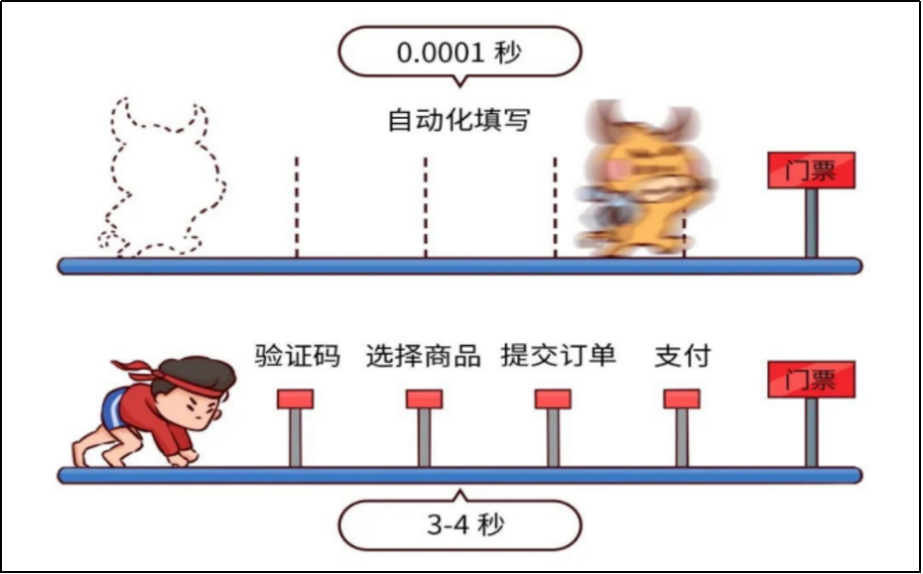 张鸿运表示,一般来说购买门票需要完成填写信息、选择、提交和支付等流程,如果是真人操作,完成整个流程最快需要三四秒,而自动化脚本可以在0.0001秒完成所有流程的自动化填写。“这就是靠手速根本无法抢到票的真正原因。”