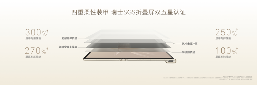 外折方案荣耀并非首者,但近些年少有人做,“因为涉及很多关键要素的突破,荣耀对于V Purse这款外折手机的思考和设计是相对比较完整的。”赵明谈到,“举一个例子,外折方案非常考验屏幕的耐磨耐摔性,因为要考虑到经常放在包里与各种东西摩擦接触,荣耀针对这一问题,加入了四层柔性装甲,使它的耐磨程度比上一代外折机提升300%,屏幕耐摔性能提升250%;屏幕耐压性能提升270%;屏幕耐蚀性能提升100%,可靠性全面领先,不用手机壳也可以无所顾忌。”