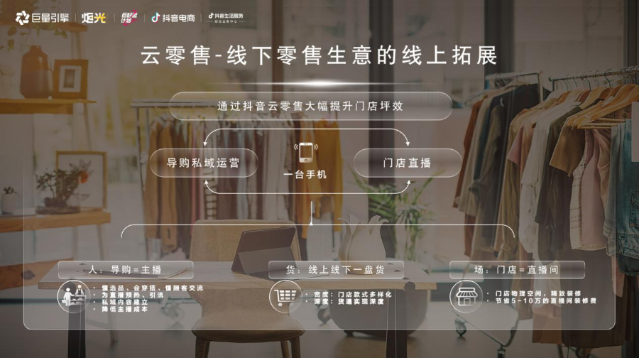 2023年,抖音云零售增长迅速,有超过150家品牌入局,2000多家开播门店。“一人一店一手机”,在人、货、场上,让导购变身主播,让现货“往上翻”,让门店变成直播间,以更高效的组织结构落地运营。商家只需一部手机在店里开播,就能做成“两 种生意”。