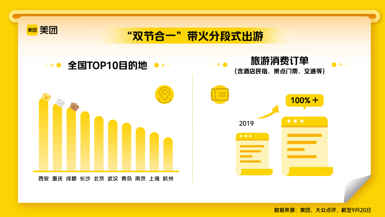 中秋、国庆“双节合一”,“十一”长假旅游热度一路上扬,预计将迎来五年来最旺“黄金周”。美团、大众点评数据显示,截至9月20日,平台上旅游消费订单(含酒店民宿、景点门票、交通等)较2019年翻倍增长,餐饮堂食订座量则增长112%。“分段式出游、一站式度假”成为今年“十一”假日消费新趋势,服务零售有望迎来全年消费新高峰。