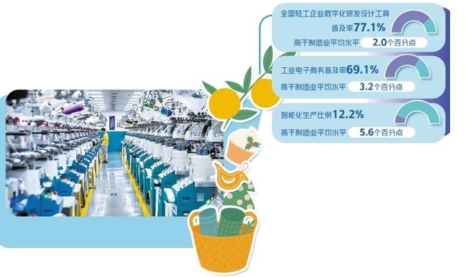 “以轻工业为例,全国轻工企业数字化研发设计工具普及率77.1%,工业电子商务普及率69.1%,分别高于制造业平均水平2.0个和3.2个百分点。”王孝洋说。