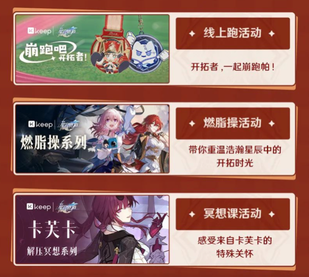 对于《崩坏:星穹铁道》来说,挖掘Keep背后的运动人群,同时获得公益系列运动和运动品牌的正能量背书。星穹铁道也希望通过线上跑、燃脂课等趣味形式,激励玩家保持运动习惯,让玩家拥有精彩的游戏体验与丰富的精神世界之外,也拥抱更加健康的生活方式。
