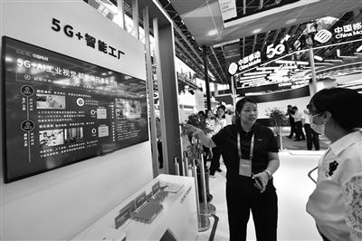 在2023中国国际数字经济博览会上,工作人员向参观者介绍5G+智能工厂项目。新华社记者 骆学峰 摄