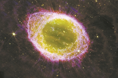 今年,韦布空间望远镜拍摄了令人惊奇的环状星云的新图像。图像显示,整个星云被一层氧气包围,当恒星发出的光经过时,这层氧气让该星云发出绿光。环状星云距地球约2600光年,位于天琴座方向,是一颗垂死恒星喷出外层形成尘埃和气体的产物。这张图像揭示了一颗恒星生命的最后篇章,也可看成太阳未来命运的预演,有助进一步了解太阳系的未来。
