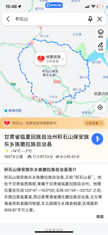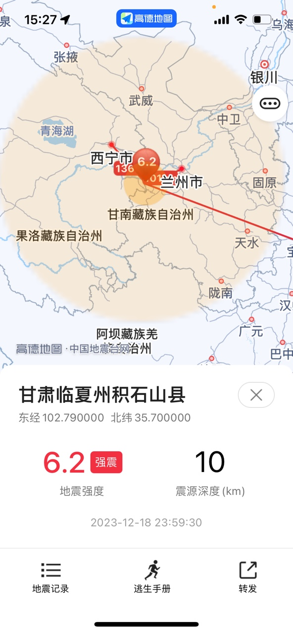 北京时间12月18日23时59分,甘肃临夏州积石山县发生6.2级地震。12月19日,高德地图联动甘肃省公安厅交通管理局,第一时间上线多项交通出行和位置相关服务,辅助保障震区群众的交通出行: