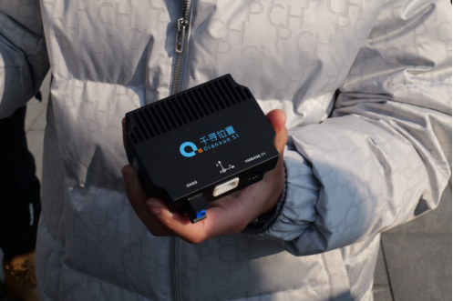 河北保定,长城汽车哈弗技术中心大楼下。千寻位置自主研发的车规级北斗高精度组合导航定位控制器(简称“高精度定位盒子”)P-box。