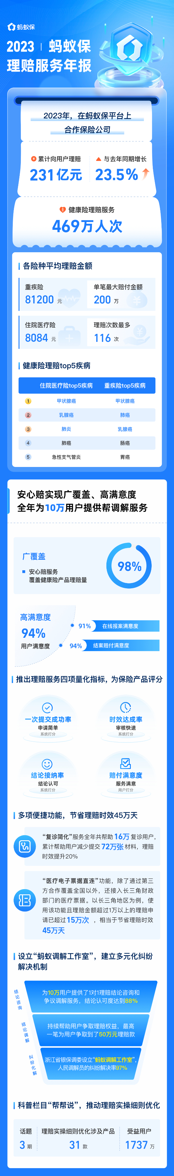 《蚂蚁保2023年理赔报告》显示,2023年,合作保险公司在蚂蚁保平台累计向用户理赔超过231亿元,同比增长23%。作为高质量理赔服务,蚂蚁保“安心赔”承诺全程协赔和速度保障,已在健康险和意外险领域实现规模化覆盖,包括门诊险、住院医疗险、重疾险和意外险,涵盖12家保司的90款产品。
