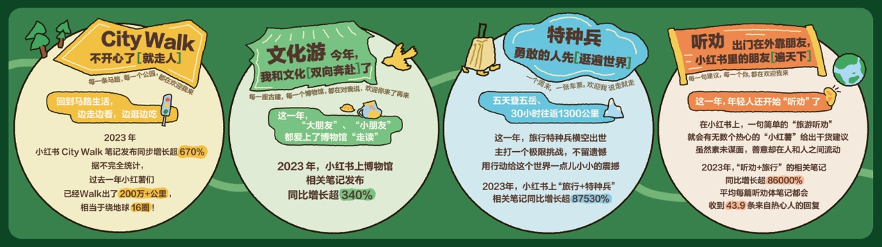 1月7日,小红书发布了《2023 年度旅行趋势报告》,“citywalk”“文化游”“特种兵”听劝等成为了小红书2023年年度旅行趋势。