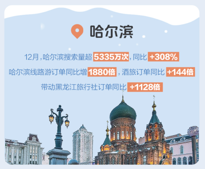 一是冰雪经济被彻底盘活,冰雪相关消费正成为一种新型消费。冰天雪地也是金山银山,在这种理念之下,相关产业链开始逐渐铺设,消费潜力更是值得挖掘,发展前景令人期待。抖音生活服务数据显示,刚过去的12月,哈尔滨抖音酒旅订单同比增长144倍,哈尔滨的线路游订单同比增1880倍。热度带动黑龙江旅行社订单环比增240%,同比增1128倍。可见,冰雪经济的齿轮已经被成功转动,冰雪经济从这个冬天开始正式起飞了。