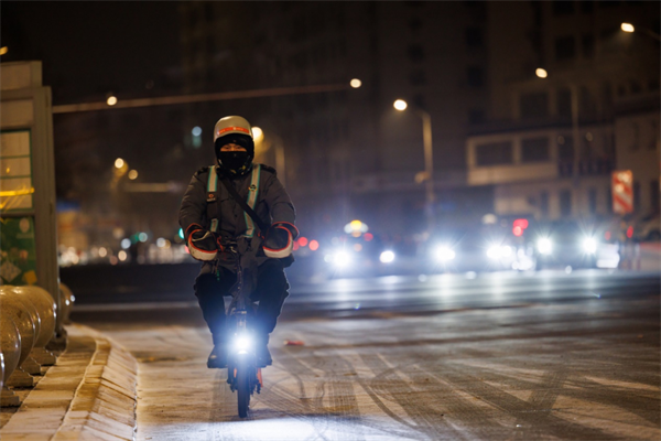 图为滴滴代驾司机夜间在路上骑行
