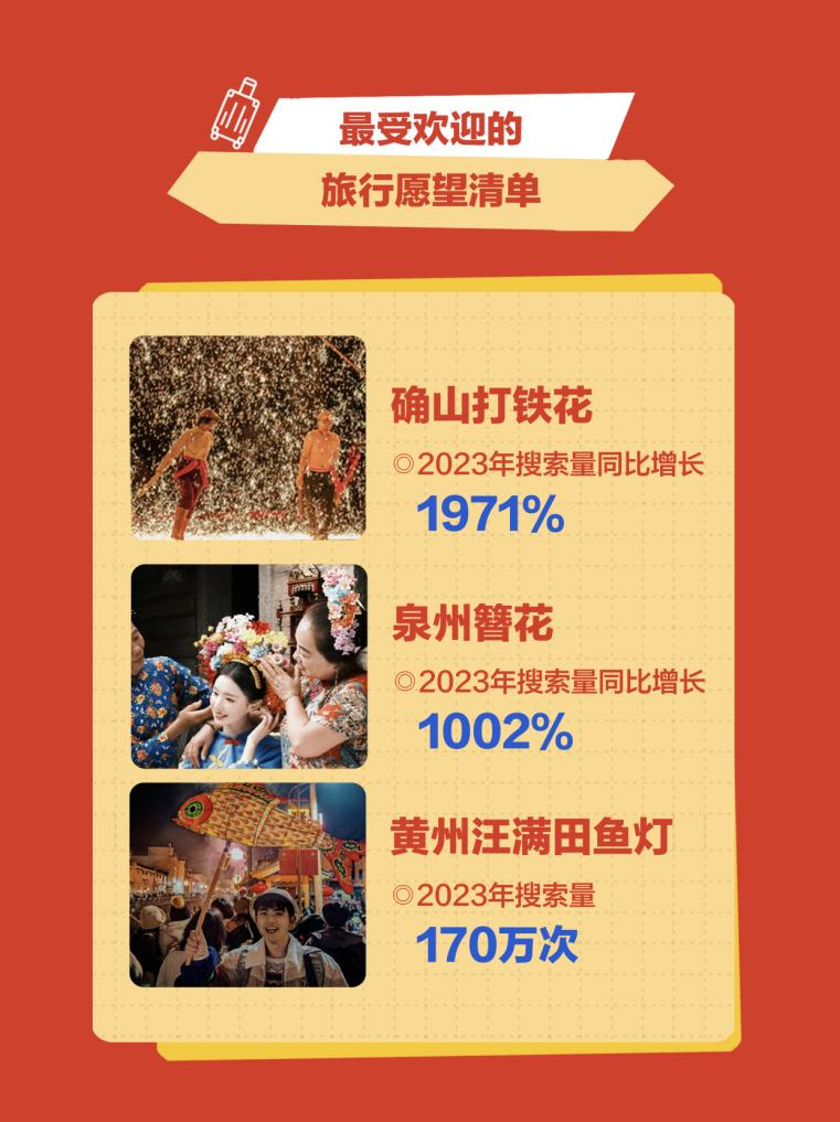 过去一年,国家级非遗“蟳埔女簪花围”在小红书爆火出圈,相关内容达1.8万篇,浏览量破7亿,福建泉州的蟳埔小渔村成为新晋旅游打卡地,很快成为旅游领域的“顶流”。除了福建泉州,确山打铁花、黄山汪满田鱼灯等非遗体验也在小红书上成为新晋热门旅游内容,吸引人们去当地探访体验。