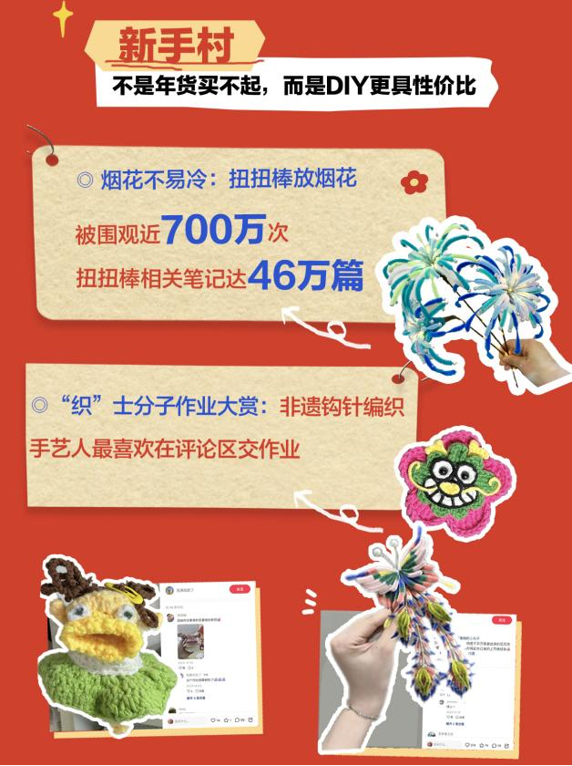 “5分钟上手”、“新手友好”等非遗手工教程成小红书热门关键词。年轻人不仅为精湛的非遗技艺点赞,也越来越爱亲自动手尝试。扭扭棒是国家非物质文化遗产绒花的“技术平替”,也是小红书手作热度最高的品类,相关笔记达46万篇。仅在今年1月,就有15万人在小红书搜索“扭扭棒教程”,用“扭扭棒放烟花”成近期热门内容,话题浏览量破700万,手工爱好者纷纷晒图把绚烂的烟花留在指尖。