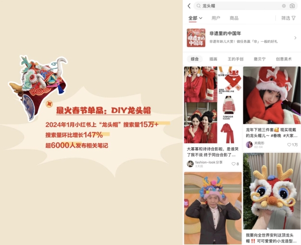 手工制作龙头帽成为小红书上的春节热门内容。春节临近,借着“戴龙头、当龙头、过龙年”的美好寓意,龙头帽在小红书的热度迅猛上升,搜索量环比增长147%,近30天就有超过6000位小红书网友发笔记分享手工DIY教程。