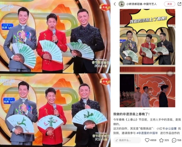 小红书创作者、90后楚氏漆艺非遗传承人郝冠雄和国风画手@瓶子为央视春晚《上春山》节目定制了大漆工艺折扇,创作故事在小红书发布后,评论区被“求链接、在哪买”刷屏,多家媒体采访报道,漆扇创作及采访笔记累计点赞超过5万次。