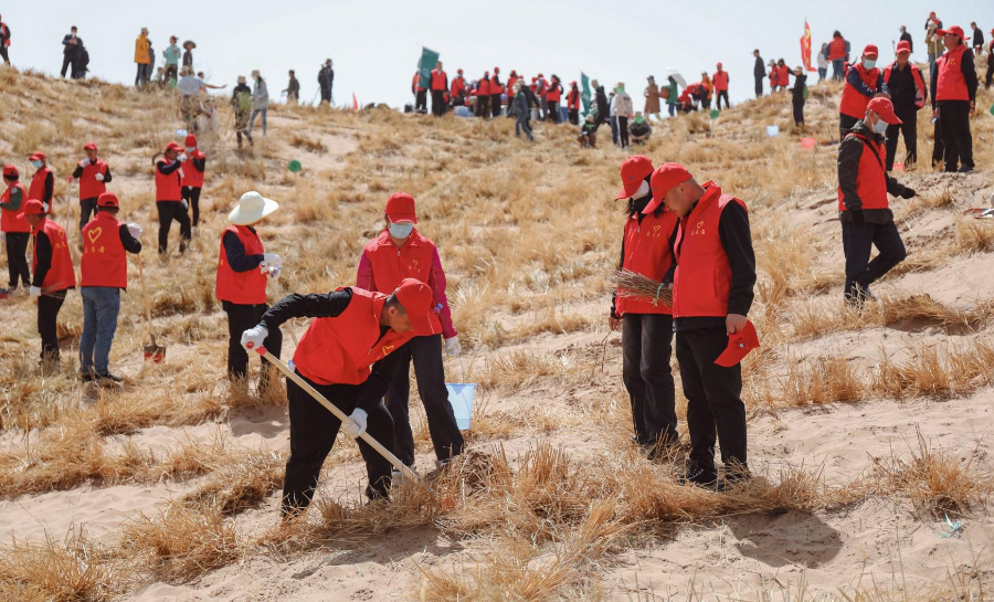 4月22日武威种树现场,在沙窝子种了25年树的王银吉再次挥起铁锹,带领民众压沙种树。“心里想着那一抹子绿,脚下的步子都更有劲了!”王银吉说。