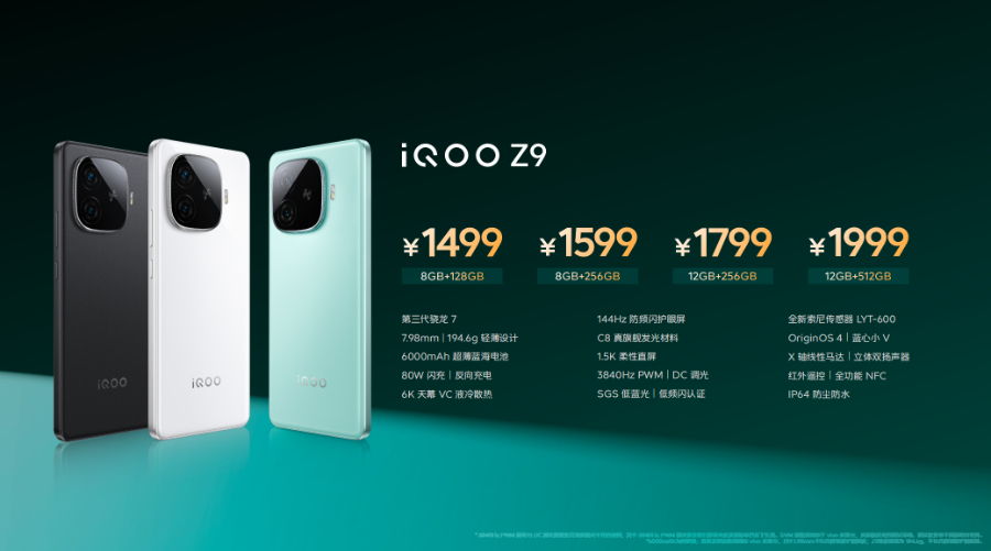 iQOO Z9的价格为1499元(8GB+128GB)、1599元(8GB+256GB)、1799元(12GB+256GB)、1999元(12GB+512GB)。