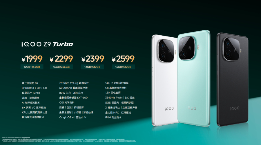 本次发布的iQOO Z9 Turbo与iQOO Z9共有星芒白、曜夜黑以及山野青三款配色。iQOO Z9 Turbo的价格为1999元(12GB+256GB)、2299元(16GB+256GB)、2399元(12GB+512GB)、2599元(16GB+512GB)。