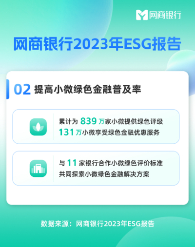 2022年网商银行参与发布了《小微企业绿色评价规范》团体标准,借助大数据和AI能力,开展小微企业的 “认绿、评绿、碳减排三步曲”,为绿色评级表现好的企业,提供优惠的绿色贷款。