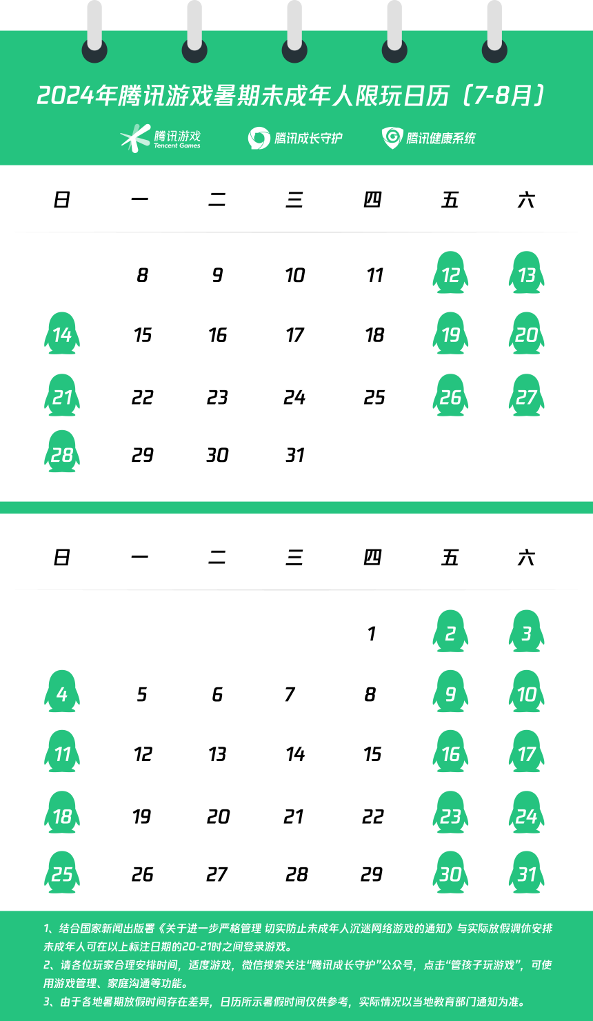 暑期将至,腾讯游戏26日发布“2024年暑期未成年人限玩日历”,对旗下所有产品的未成年人游戏时间做出规定,并再度呼吁未成年玩家合理安排游戏时间,适度游戏。