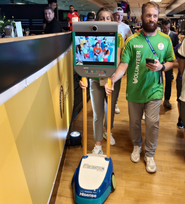 自6月14日欧洲杯开赛以来,印有醒目海信logo的互动机器人活跃在赛场周边。通过小小的一块屏幕,不同国家的住院儿童可以参观平时无法进入的球员赛前热身区、球队更衣室等区域,跟自己喜欢的球员或者球队进行实时互动。借助这种方式,无法亲自前往球场的孩子们离自己的足球梦想更进一步,亲切地体会到足球运动的乐趣。
