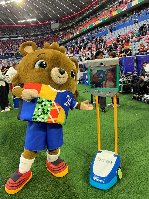 来自法国里昂的癌症治疗中心的住院儿童通过机器人参观了法国队更衣室,并与法国队球星姆巴佩、吉鲁、格列兹曼等进行了亲密互动,同时通过机器人在球场周围观看了球员热身,随后进入了球场VIP长廊,与法国足协主席菲利普·迪亚洛进行了互动。除此之外,意大利著名守门员布冯,以及现役主力门将多纳鲁马、葡萄牙球星C罗、佩佩、莱奥、若塔等均在比赛前,依次通过机器人与连线的小朋友进行了互动,积极参与到助力儿童圆梦欧洲杯的公益活动中。