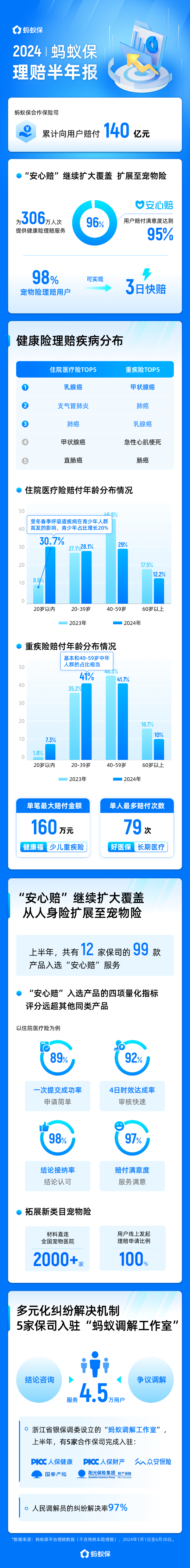 7月15日,互联网保险代理平台蚂蚁保发布《2024年蚂蚁保平台理赔服务半年报》(以下简称《半年报》)。截至6月30日,合作保险机构通过蚂蚁保平台累计向用户理赔140亿元,同比增30%。