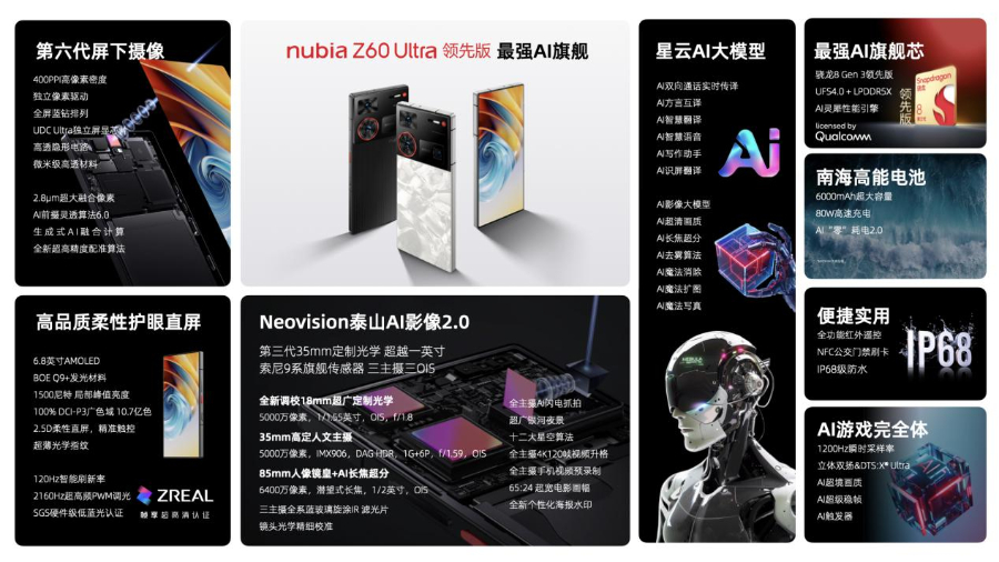 7月23日,努比亚推出“全面超大升,超强超AI”的努比亚Z60 Ultra领先版和专为年轻人打造的努比亚Z60S Pro。两款新机依托自研星云AI大模型,带来AI+屏下、独家AI+骁龙芯,以及Al+卫星通信和Al+影像等诸多创新。