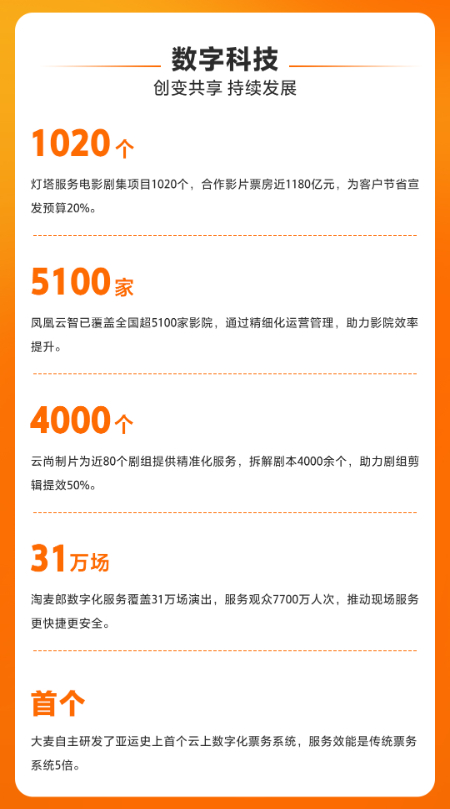 大麦作为专业的演出票务平台,注重用户服务与产品体验的持续优化和创新。报告期内,大麦开发了亚运会历史上首个数字化票务解决方案——云上数字化票务系统,实现了30秒内为10万量级的座位自动配座,效率达到传统系统5倍以上,圆满完成了杭州第19届亚运会全链路票务服务工作;在现场服务体验上,淘麦郎秉承数字化、专业化、标准化服务理念,财年内高质量、高效率服务演出31万场,服务观众7700万人次。