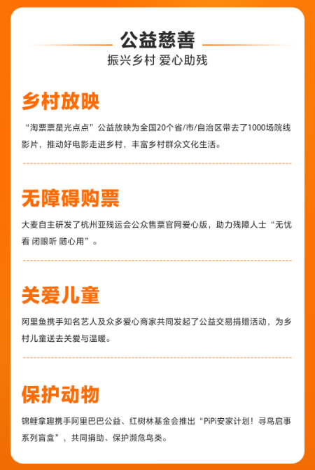 为丰富乡村群众的文化生活,缩短城乡公共文化服务差距,阿里影业联合阿里巴巴公益发起“淘票票星光点点”公益放映项目,发挥阿里影业“内容+科技”的优势,推动新上映的优质影片在乡村开展公益放映,提升乡村群众的获得感和幸福感,助力乡村文化振兴。